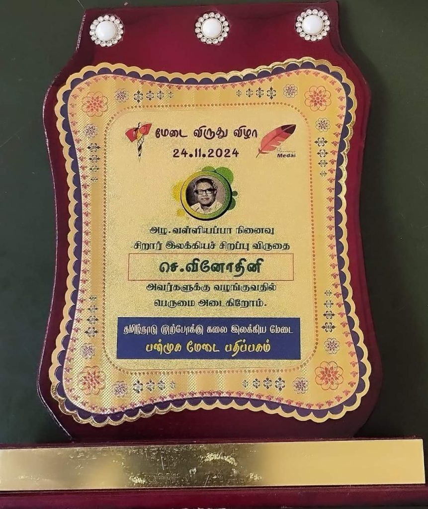 • தமிழ்நாடு முற்போக்கு கலை இலக்கிய மேடையில் “சிறார் இலக்கிய விருது” எழுத்தாளர், தமிழச்சி தென்றல் வினோவிற்கு, சாகித்திய அகாதமி விருதாளர் மதிப்பிற்குரிய சா. தேவதாஸ் அவர்களால் வழங்கப்பட்டது.
