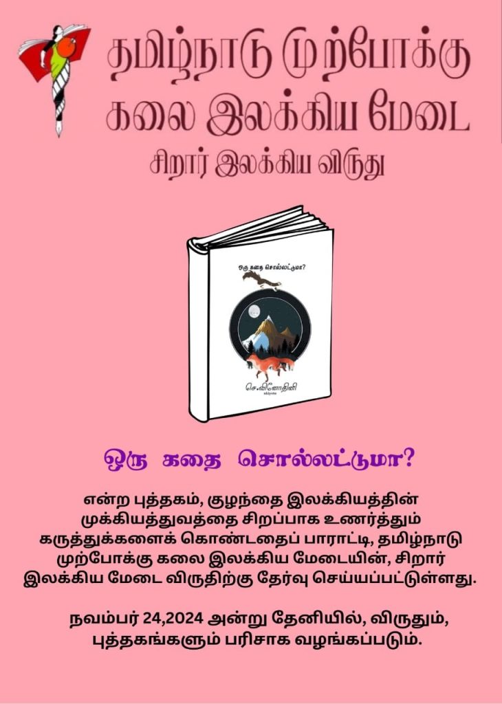 இன்று 24.11.2024 தேனி, வாசவி மஹாலில், தமிழ்நாடு முற்போக்கு கலை இலக்கிய மேடையில் “சிறார் இலக்கிய விருது” அகழ் கலை இலக்கிய மன்றம், 30 சிறார்களைக் கொண்டு உருவாக்கிய “ஒரு கதை சொல்லட்டுமா?” என்ற புத்தகத்திற்கு, சாகித்திய அகாதமி விருதாளர் மதிப்பிற்குரிய சா. தேவதாஸ் அவர்களால் வழங்கப்பட்டது.