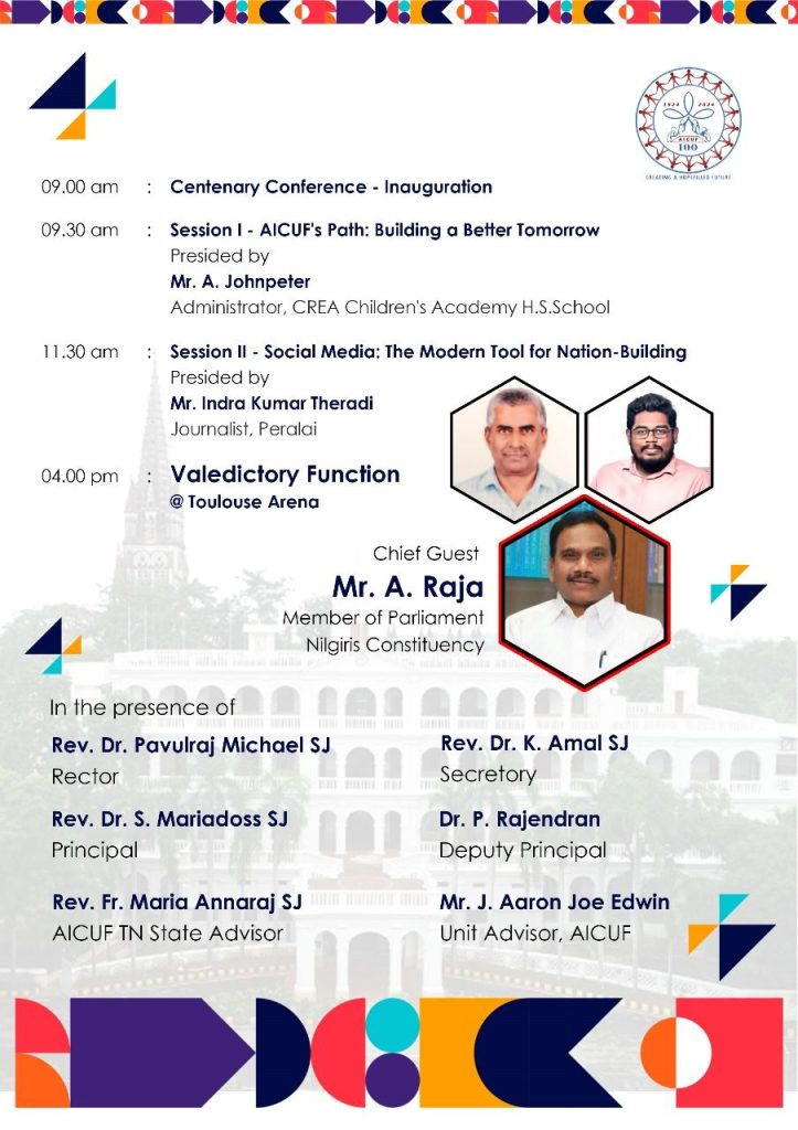 அய்க்கஃப் நூற்றாண்டு நிறைவு விழா மாநாடு! அகில இந்திய கத்தோலிக்கப் பல்கலைக்கழக மாணவர்கள் கூட்டமைப்பு (அய்க்கஃப்) 1924 ம் ஆண்டு Rev. Fr.கார்ட்டி சே.ச அவர்களால் செயின் ஜோசப் கல்லூரி, திருச்சிராப்பள்ளியில் துவங்கப்பட்டு இன்று இந்திய அளவில் 15க்கும் மேற்பட்ட மாநிலங்களில் செயல்பட்டு வருகின்றது. இதன் நூற்றாண்டு விழாவானது பல்வேறு தளங்களில் கடந்த ஓராண்டாய் (2024-25) கொண்டாடப்பட்டு வருகின்றது. அதன் தொடர்ச்சியாக நூற்றாண்டு நிறைவு விழா மாநாடானது 15 மார்ச் 2025 அன்று செயின் ஜோசப் கல்லூரியின், தூலூஸ் அரங்கில் முன்னாள் தேசிய ஆலோசகர் Rev.Fr. K. அமல் சே.ச அவர்கள் தலைமையில் கல்லூரி அதிபர், முதல்வர் மற்றும் அய்க்கஃப் ஆலோசகர்கள் முன்னிலையில் நடைபெறுகின்றது. இதில் மாண்புமிகு. நாடாளுமன்ற உறுப்பினர் திரு.A. ராஜா அவர்கள் சிறப்பு விருந்தினராய் கலந்து கொண்டு நூற்றாண்டு நிறைவு விழா பேருரை வழங்குகிறார்.