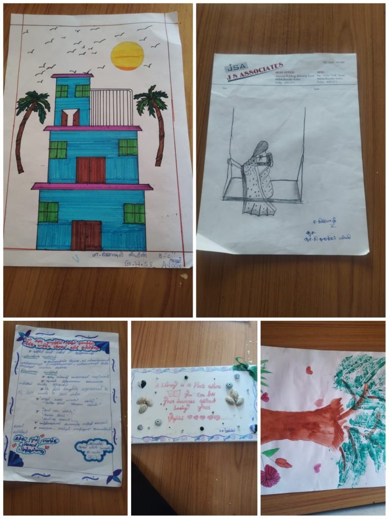 மாணவ/மாணவிகள் தங்களின் கைவண்ணத்தில் ஓவியங்கள் வரைந்தனர். ஓவியக் கலை, மாணவர்களின் சிந்தனையை ஊக்குவிக்க, உளச்சாந்தி மற்றும் கற்பனை திறனை வளர்க்க உதவுகிறது.