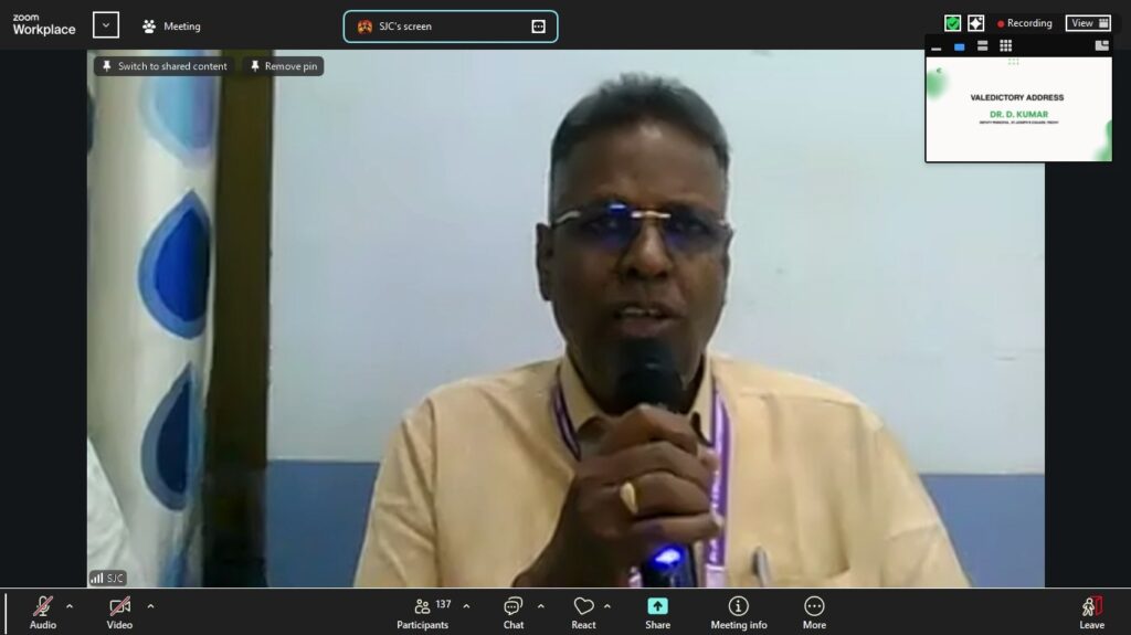 The Department of Commerce (Shift II), St. Josephs College (Autonomous), Tiruchirappalli, organized a One-Day National Level Virtual Conference on Sustainable Development, Digital Transformation, and Emerging Paradigms in Commerce and Management on 23 January 2026 through online mode.