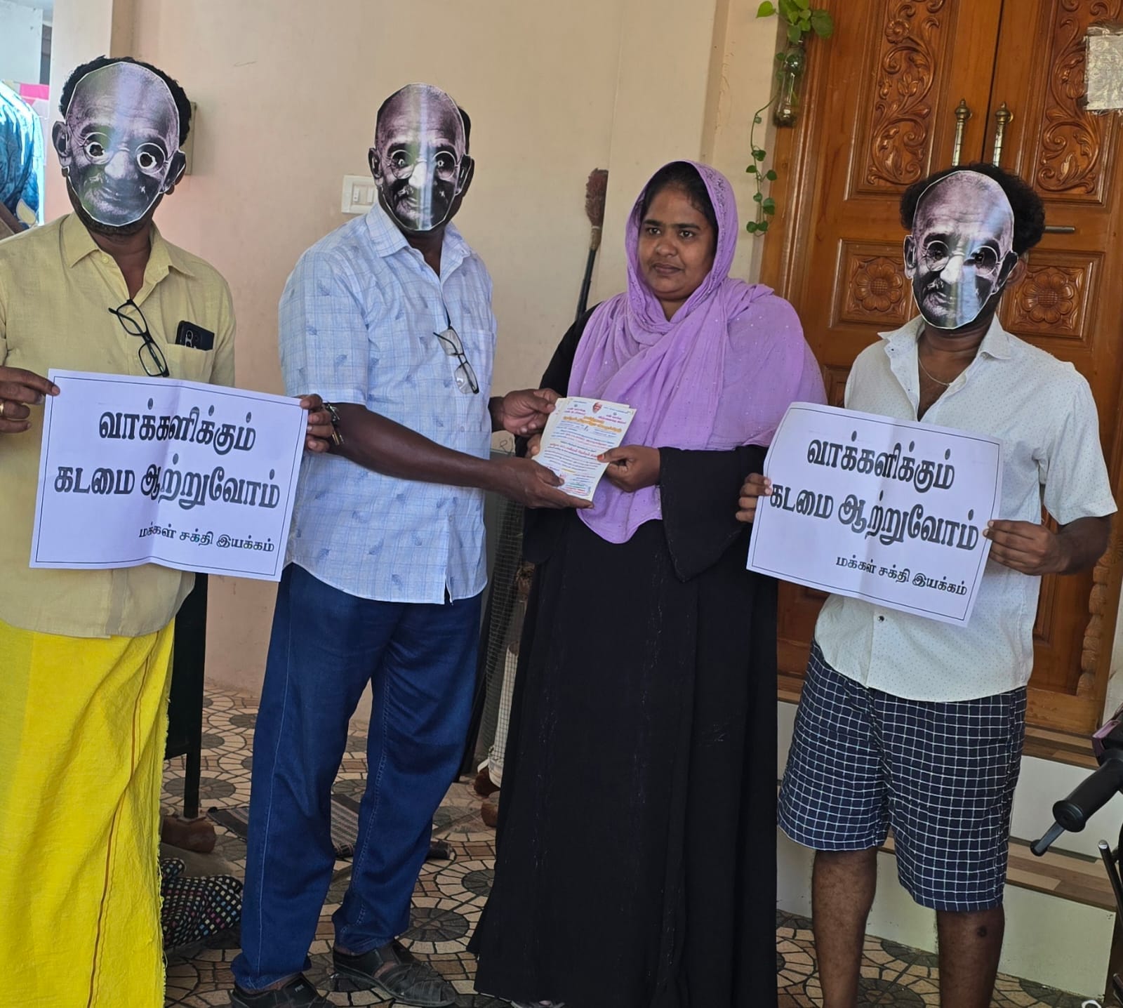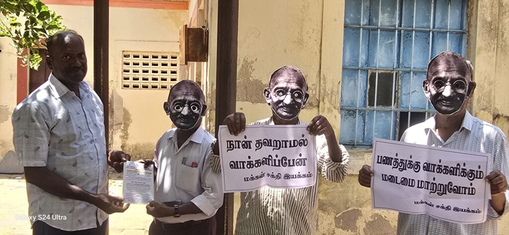 மக்கள் சக்தி இயக்கம் மாநில பொருளாளர் தலைமையில் தேர்தல் விழிப்புணர்வை ஏற்படுத்தும் நோக்கில், மகாத்மா காந்தி அவர்களின் முகமூடி அணிந்த பொதுமக்களை சந்தித்தனர்.