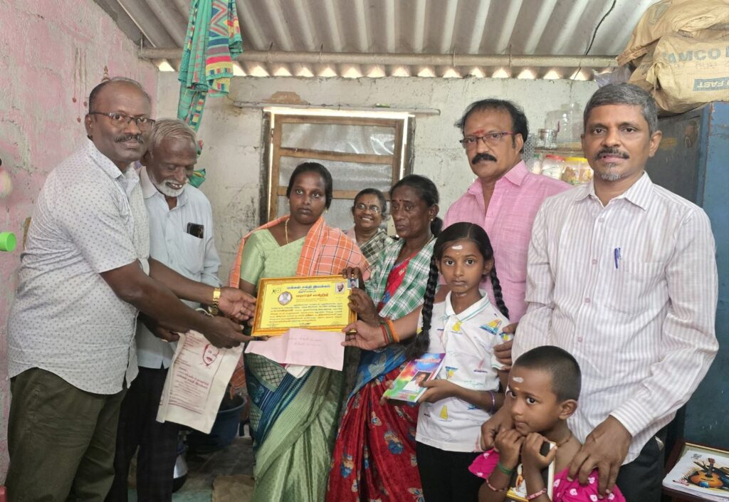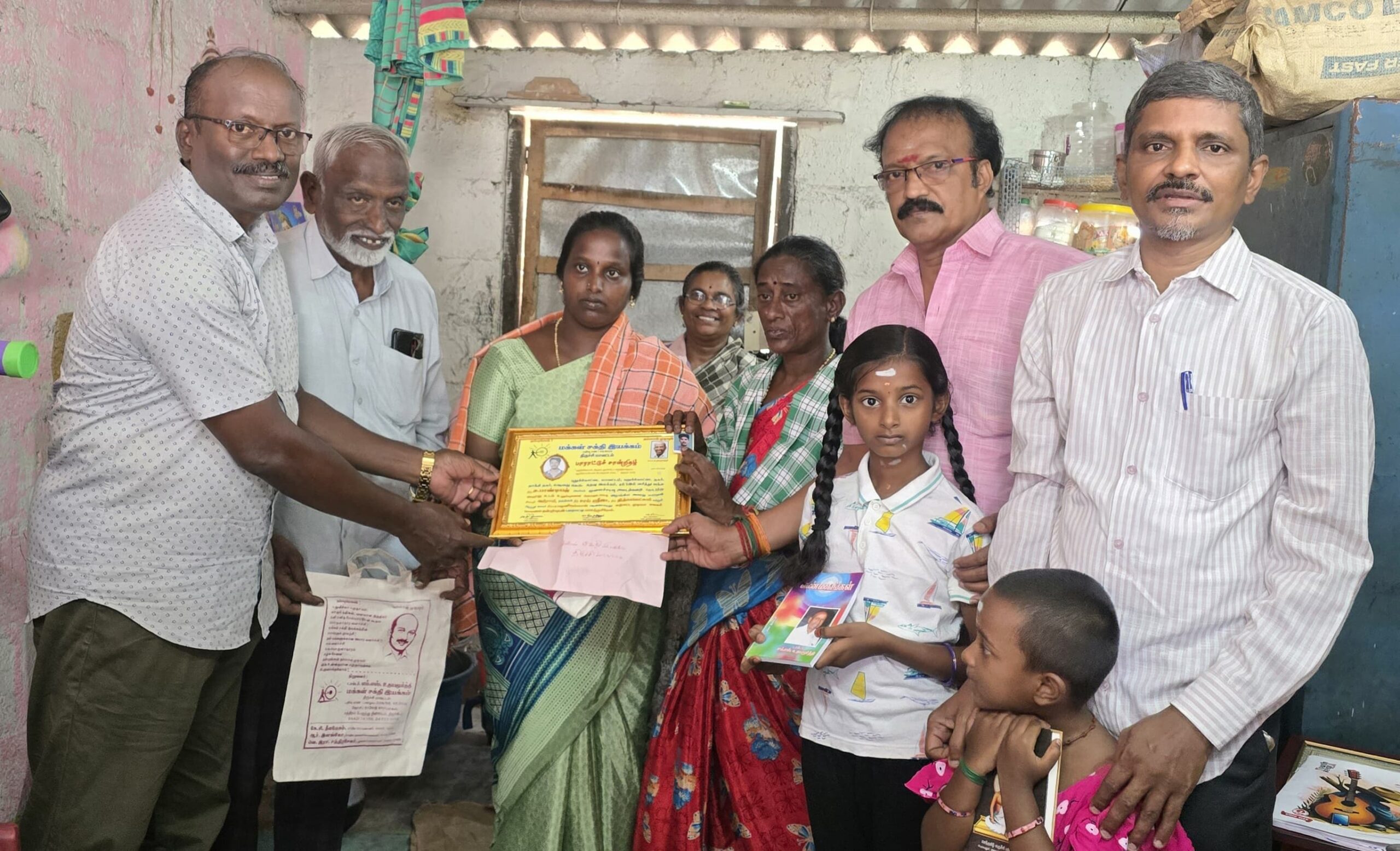 வெ. இரா. சந்திரசேகர், துணைச் செயலர் இரா. இளங்கோ, தண்ணீர் அமைப்பு இணைச் செயலர் ஆர்.கே. ராஜா, அமிர்தம் சமூக சேவை அறக்கட்டளை நிர்வாக அறங்காவலர் யோகா ஆசிரியர் பெ.விஜயகுமார் ஆகியோர் புதுக்கோட்டை மாவட்டம் காந்தி நகர் பகுதியில் வசித்து வரும் திருமதி அபிராமி பாண்டியன், மகள்கள் பா.சாய் ஸ்ரீஜா, பா.நித்யலெட்சுமி மற்றும் அவரது தாயார் க.பழனியம்மாள் ஆகியோரின் ஈகைச் செயலைப் பாராட்டி நிதியாக ரூ10000,/ டாக்டர் எம்.எஸ். உதயமூர்த்தி புத்தகம், திருக்குறள் புத்தகம், கதர் ஆடை அணிவித்து, சான்றிதழ் வழங்கி நன்றி தெரிவித்தனர்.