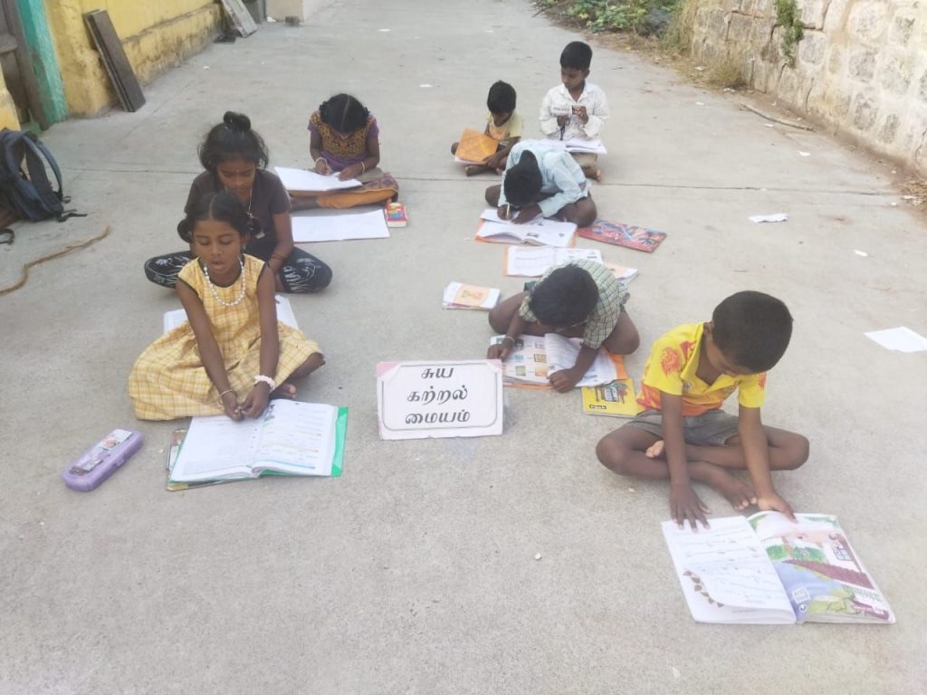 பள்ளி தலைமை ஆசிரியர் திரு. ஆர். ரவிச்சந்திரன் தலைமையில், குழந்தைகள் தங்களது வசிக்கும் தெருவில் சுய கற்றல் மையங்களை உருவாக்கி படிக்கும் பணியில்  குழந்தைகள் ஈடுபடுகின்றனர்.