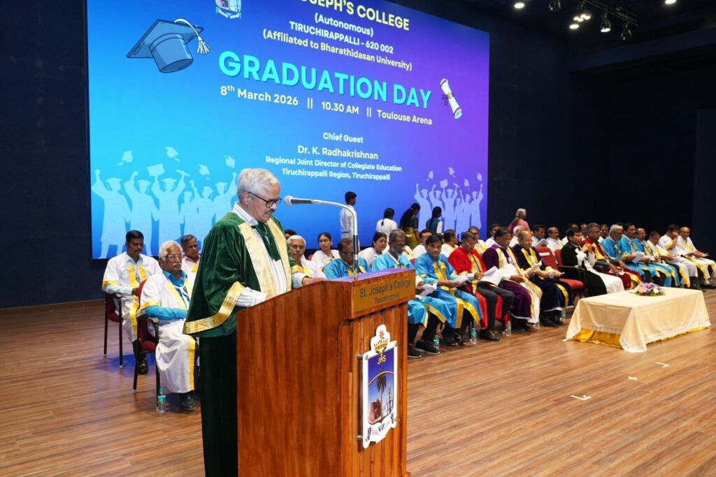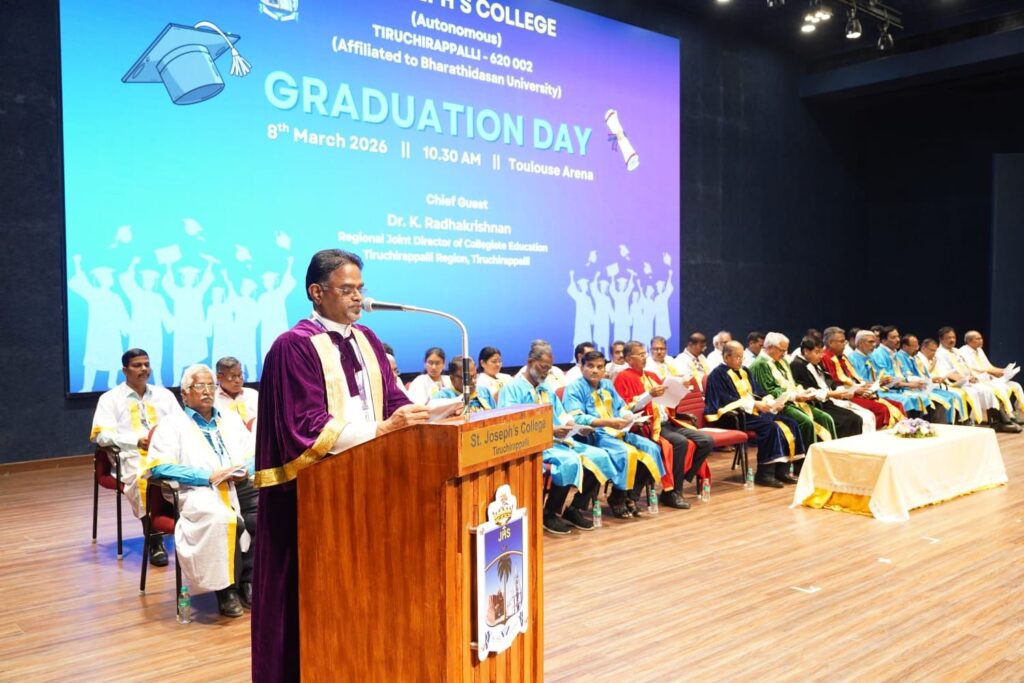 திருச்சி தூய வளனார் தன்னாட்சி கல்லூரியில் 8.3.2026 அன்று பட்டமளிப்பு விழா நடைபெற்றது. பட்டமளிப்பு விழாவில் மண்டல கல்லூரிக் கல்வி இணை இயக்குனர் முனைவர் க. இராதாகிருஷ்ணன் பங்கேற்று மாணவ மாணவியருக்குப் பட்டங்களை வழங்கி பட்டமளிப்பு விழா பேருரை ஆற்றினார்.