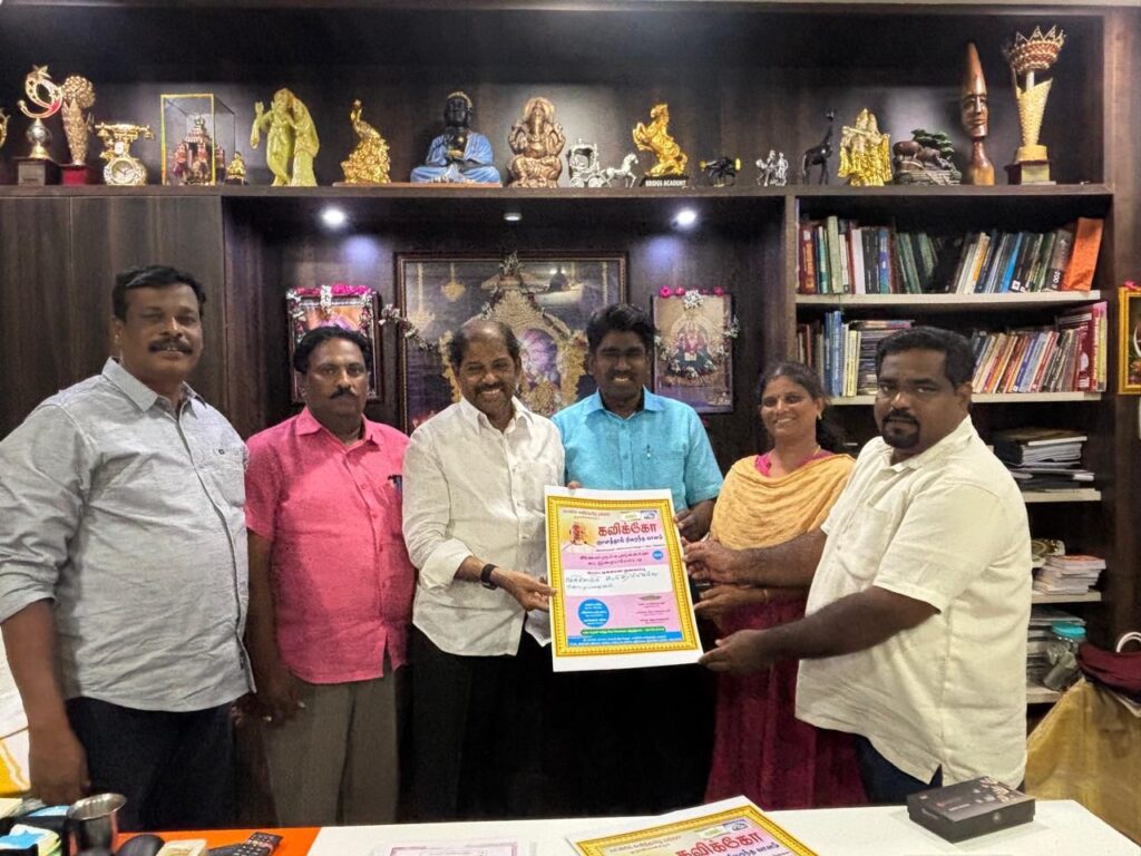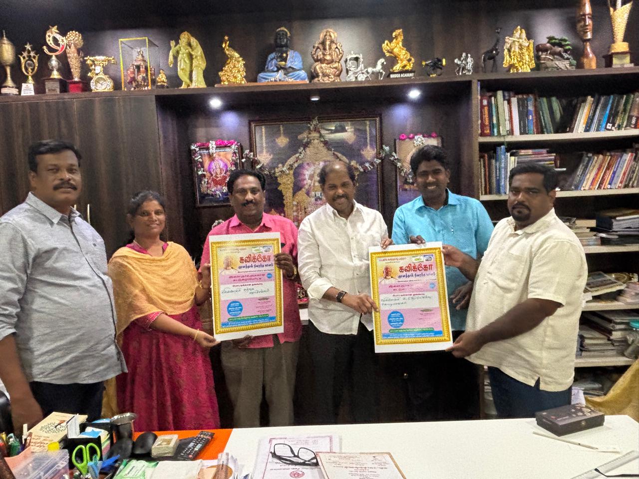 திருச்சிராப்பள்ளி காவிரிக் கவித்தமிழ் முற்றம் & ஈகைச்சிறகுகள் அறக்கட்டளை இணைந்து நடத்திடும் கவிக்கோ அப்துல்ரகுமான் குறித்த மாநில அளவிலான கட்டுரைப் போட்டிக்கான அறிவிப்பை புதுக்கோட்டைத் தமிழ்ச்சங்கத் தலைவர் தமிழ்ச்செம்மல் கவிஞர் தங்கம் மூர்த்தி வெளியிட கவிஞர் ஆலங்குடி வெள்ளைச்சாமி. கவிஞர் மகா.சுந்தர். கவிஞர் பீர் முகமது ஆகியோர் பெற்றுக் கொண்டனர். உடன் காவிரிக் கவித்தமிழ் முற்றத்தின் செயல் இயக்குநர் லி.மெர்சி டயானா மற்றும் முனைவர் ஜா.சலேத்.