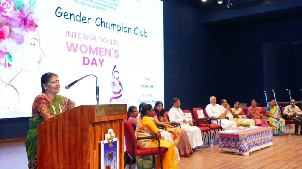பாலினச் சமத்துவத்தை உரிமையாகப் பெறுவதற்கும், இணைந்து பயணிப்பதற்கும் உறுதி எடுப்பதற்கே இந்த நிகழ்வு. திருச்சி செயின்ட் ஜோசப் கல்லூரி மகளிர் தின விழாவில் வழக்கறிஞர் ஜெயந்தி ராணி பெருமிதம் திருச்சி செயின்ட் ஜோசப் கல்லூரியில் உலக மகளிர் தின விழா சிறப்பாகக் கொண்டாடப்பட்டது.